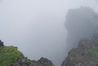 | 七高山頂上付近。崖が切り立ち、霧と強風で怖さが倍増。 新山へ歩を進めることが出来なかった。 |