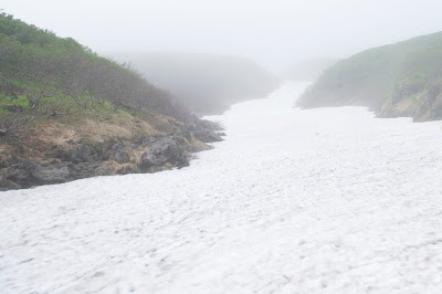 いくつも越えていったのだが、ガスのため雪渓の出口を何度も間違いそうになった。