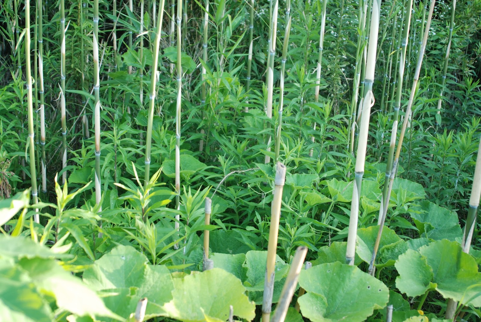 カボチャの苗が伸びるところでは、雑草やキクイモとの競い合い。