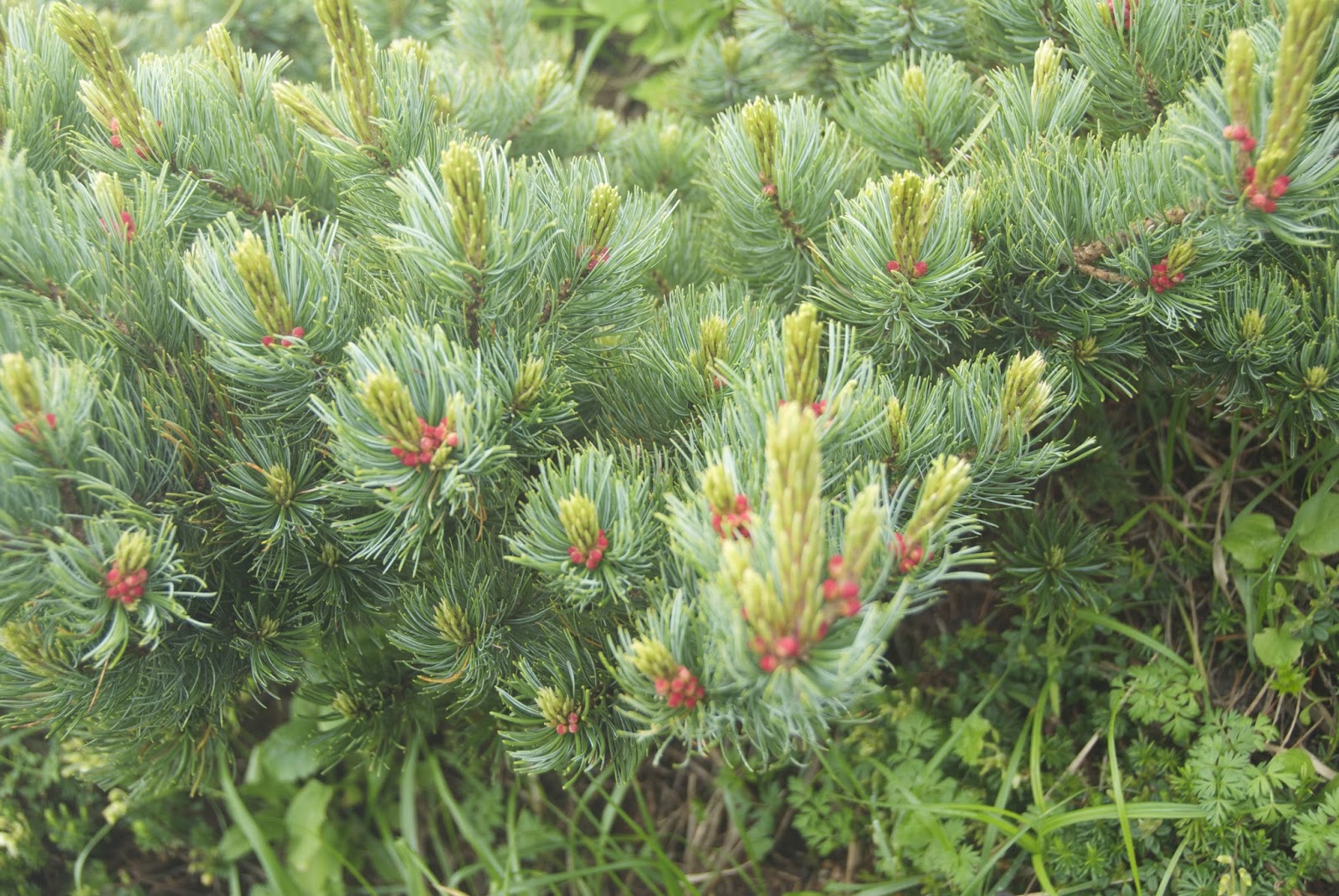 | ハイマツに松ぼっくりの赤ちゃんのピンクの色がよく似合う。 |