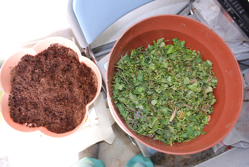 土が落ちた雑草を天日干しにして,切り刻んで、再度それを水に漬けて適度なウェットな感じで餌として与えれば,土の混入や根から芽が出てくることも気にしなくて良さそうだ。