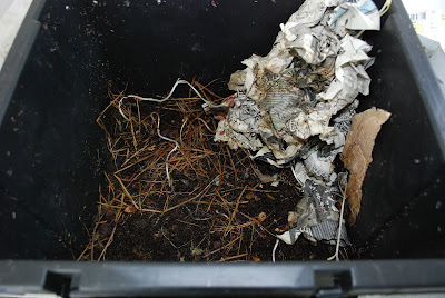 こちらは4月中旬に設定した畑コン5号。餌にはピーピーマメと新芽付きのキクイモを与えていた。ウェットな堆肥が出来ていたが繊維成分が多く堆肥収穫が難しそうだった。