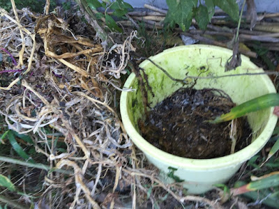 こちらの雑草野菜ミミズコンポストには、ツルムラサキなど栄養分の多そうな餌を十分に与え、バケツ3段のミミズ君をここに移動させた。