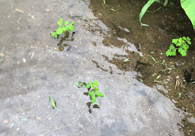 | 水はけのいい第2菜園でも、畝の周りは水たまり。 長靴がずぼずぼ埋まって歩きにくかったが、高畝の苗は無事。 |