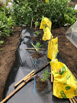 マルチを敷き、そこにビニールトンネルにあったトマト苗を4本移植した。