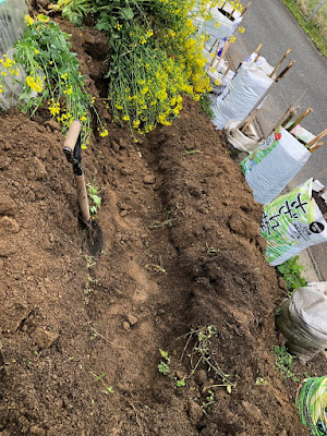 まずは、ブロッコリーの苗を片付けた後、いつものように畝の真ん中に溝を掘った。