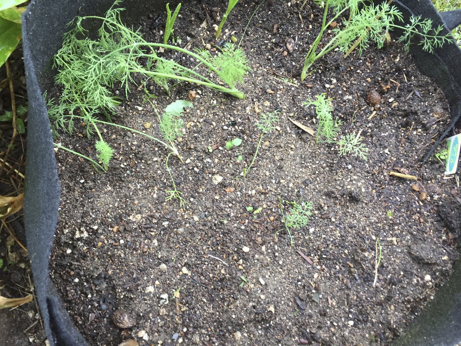 | ディルやフェンネルは移植には向かないと聞いた。 特に、先日苗が枯れたこの袋の中は、環境が今ひとつになっている可能性がある。 1本でも、ここで育ってくれると嬉しいのだが。。 |