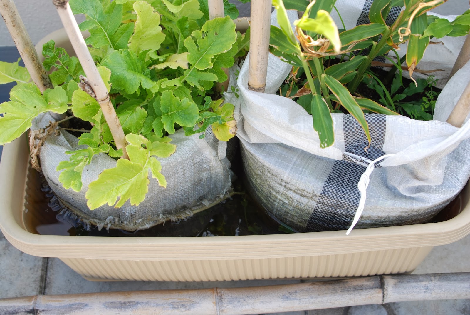 腰水法(storage water infiltrating system)は、私がプランター内の土嚢袋への水やりをさぼりたいがためにとっている方法だ。