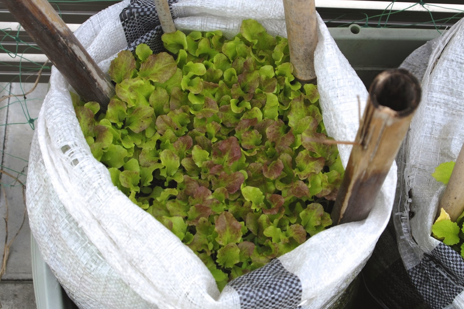 去年、サニーレタスはプランターからの移植でうまくいったので、今年はこの土嚢袋に最初から移植用に育苗していたのだ。