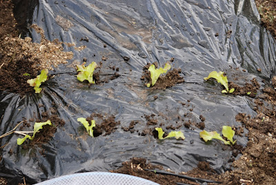 | 土嚢袋から掬ったサニーレタスの苗はこんな感じで畝に植えていく。 1ヶ月もしたら、小さいレタスが出来るようになるだろう。 |