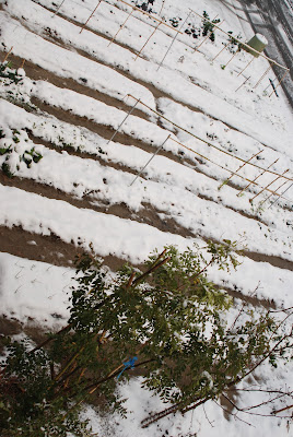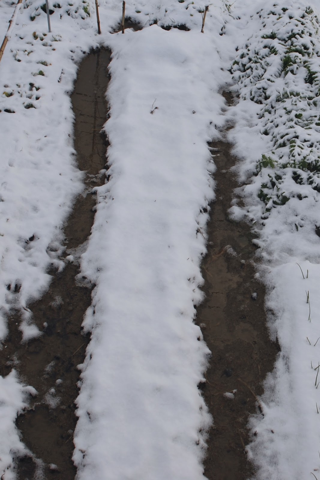 雪景色の中で上から見ると、今から広くする必要がある畝がよくわかる。