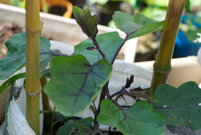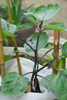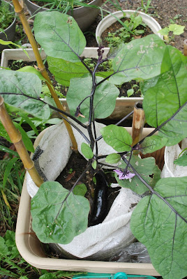 | まだ苗は弱々しいので、ナスはまだ小さめだが、この時点で初収穫となった。 |