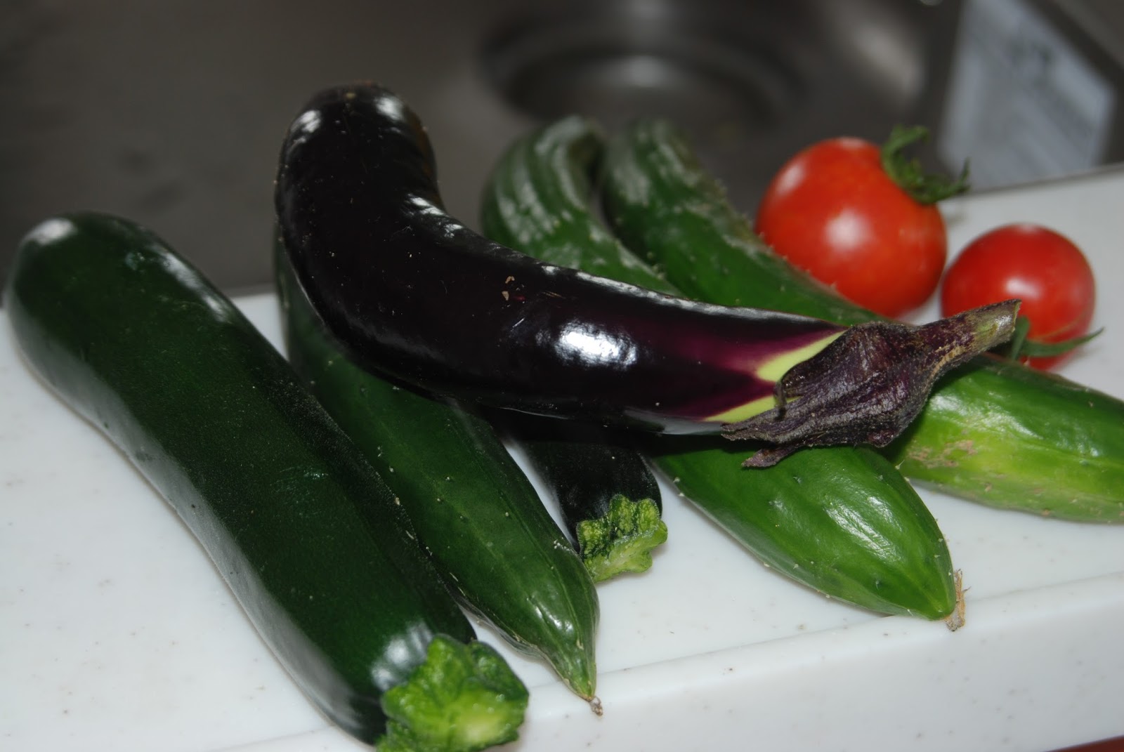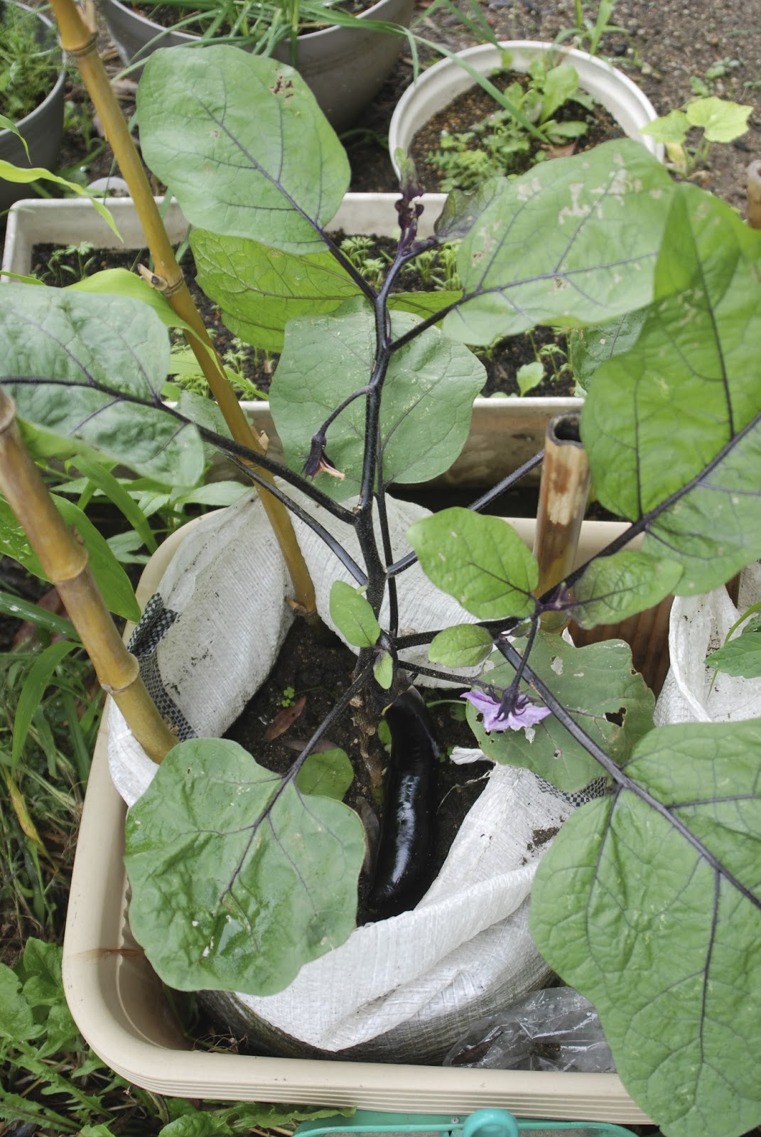 | まだ苗は弱々しいので、ナスはまだ小さめだが、この時点で初収穫となった。 |
