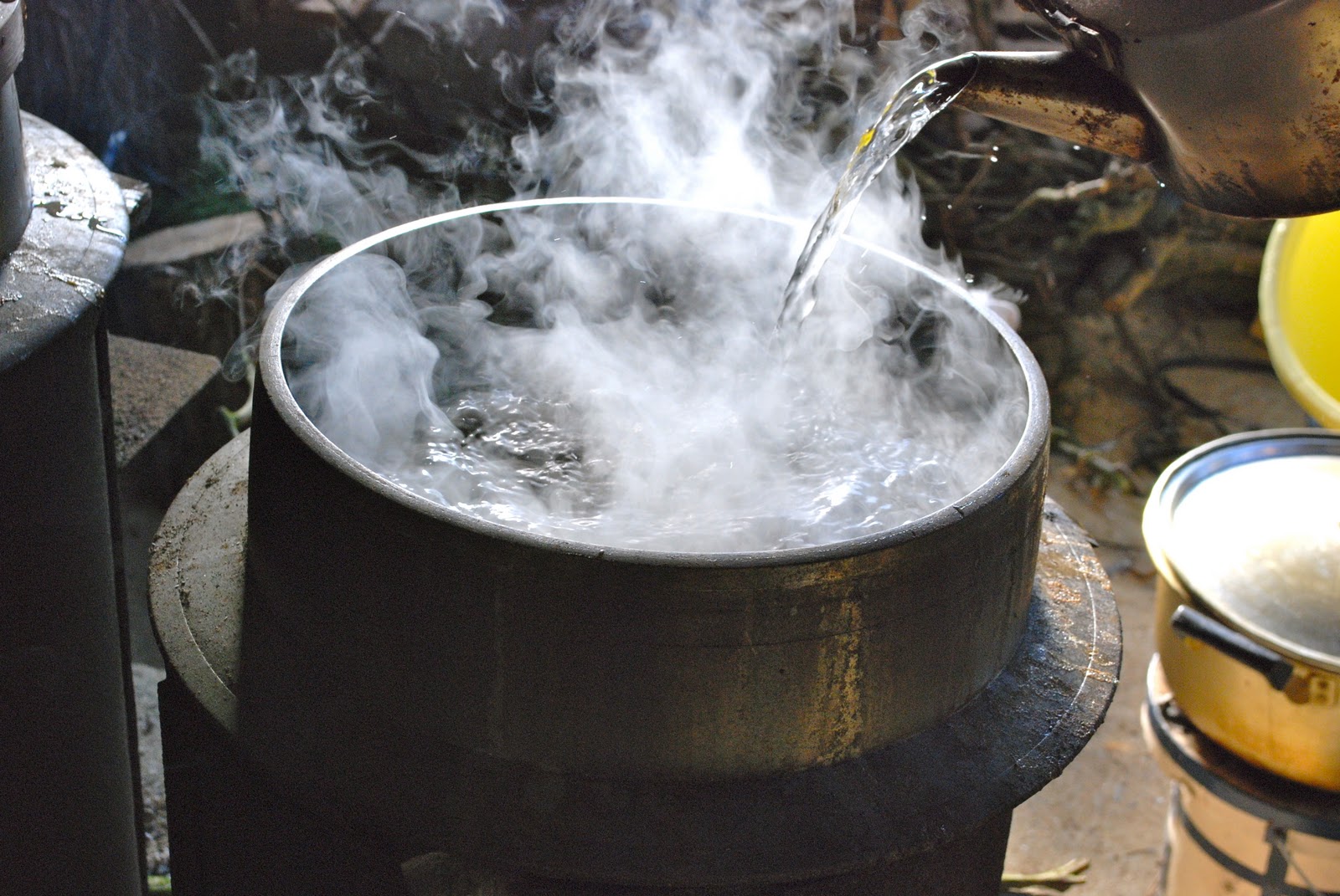 | こんな感じで釜からはモクモクと湯気が出ている。この湯気で餅米がおいしく蒸されていく訳だ。火の番も大事な仕事なのだ。 |