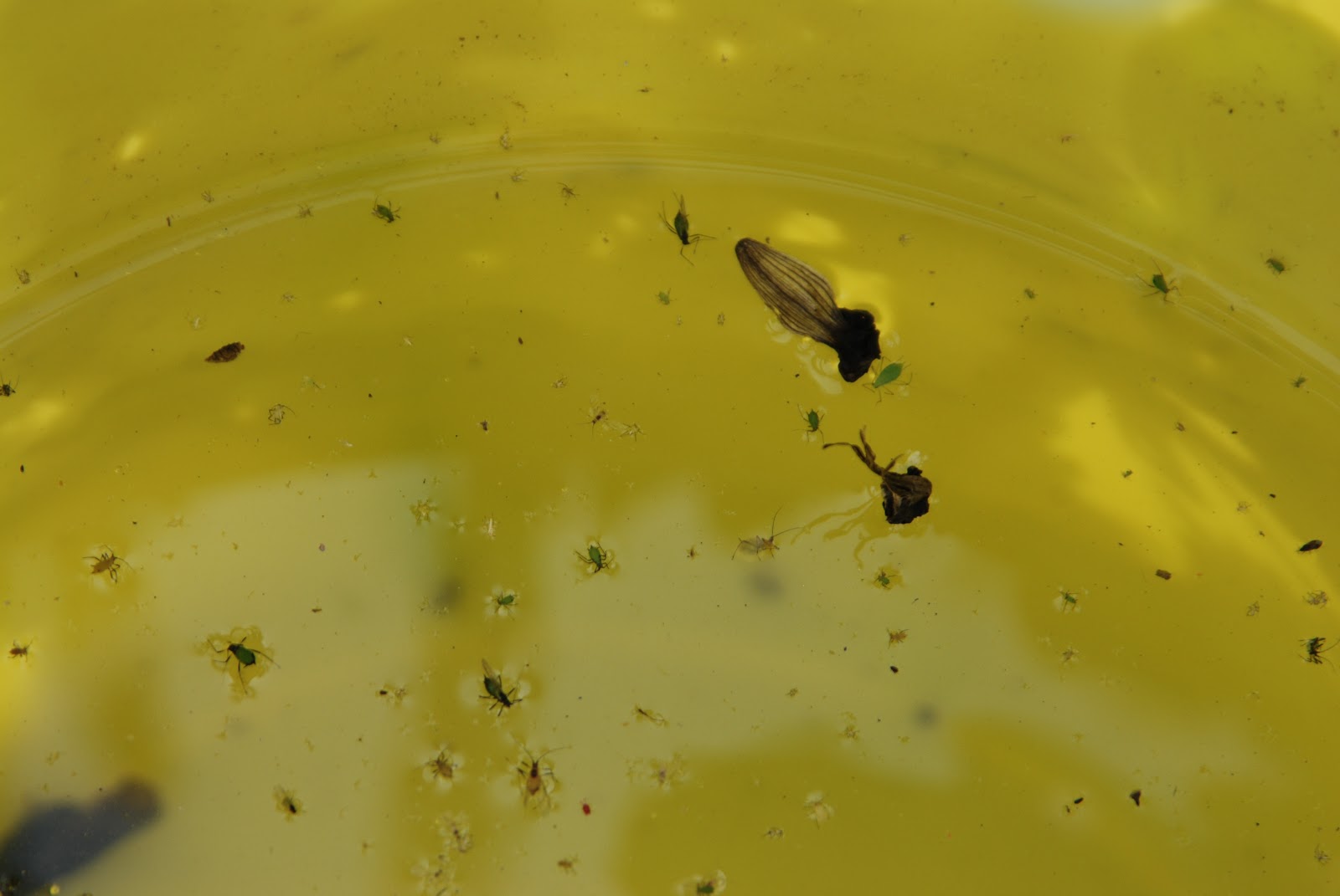 | 間違いなくアブラムシも入っていた。 それ以外の虫も黄色は好きなのだろうか?結構色々な小さな虫が入っている。 |