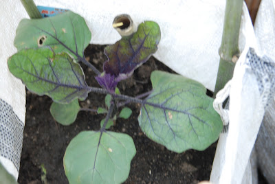 同時期に畝に植えたナスはとても元気で、もう花が咲き始めている。