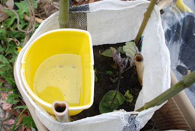 そこで、土嚢袋の中にはバケツは置けないので小さめの黄色の容器を据えてみた。