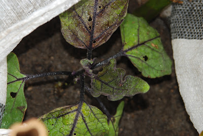 下の写真は土嚢袋に植えて間もなく、まだ元気だった頃のナスの苗。