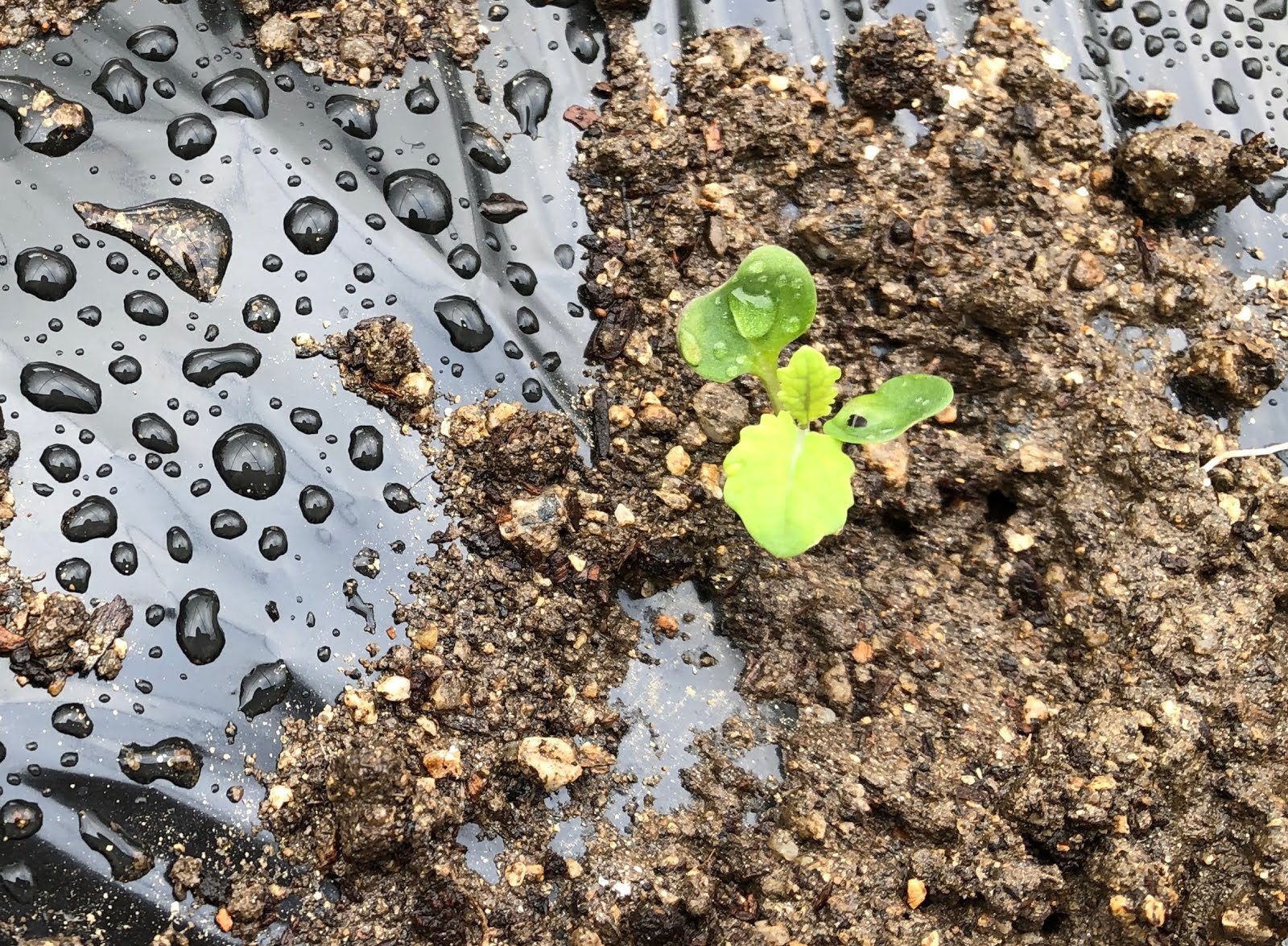 こちらは、すべての小さな苗を、そのマルチを敷いたトンネル内に移植したところ。