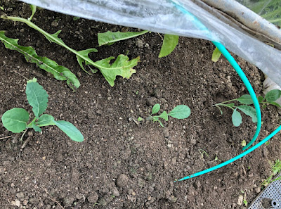 ビニールトンネルの下に小さな苗を移植した場合、ポットでなくても今日のような晴天の日には容易に水不足で悲惨な状態になるので、まずはたっぷり水を与えておいた。