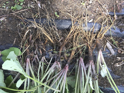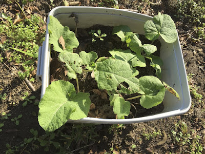 | こちらも1ヶ月前に見たときと比べると、僅かに葉が大きくなっている程度。 それでも、料理に使ってもらうゴボウが欲しかったので収穫してみた。 |