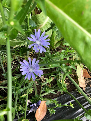 トウが立ち始めたリーフチコリーには花も咲き始めた。