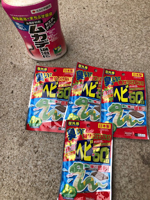 蛇たちには悪いが、仕事場に近寄れないようにこんなものを使った。 ここ数年使って効果があったようなので、今日も仕事場の周りに置いていった。 |