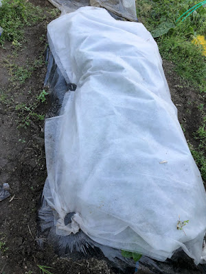 一方、こちらは同じく第2菜園のメインの畝で、最初から少し緩めに不織布をかけていたところ。