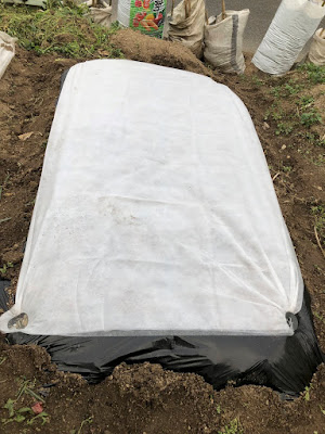 この時期に植えている種芋は去年の夏に収穫したものと、今年に入ってから収穫したものがあるのだが、去年の夏収穫の種芋は1月に植えた時点で結構芽が出ていたためか、苗がそれなりの大きさになったみたいで、霜予防にかけていた不織布が下から突き上げられる感じになっていた。