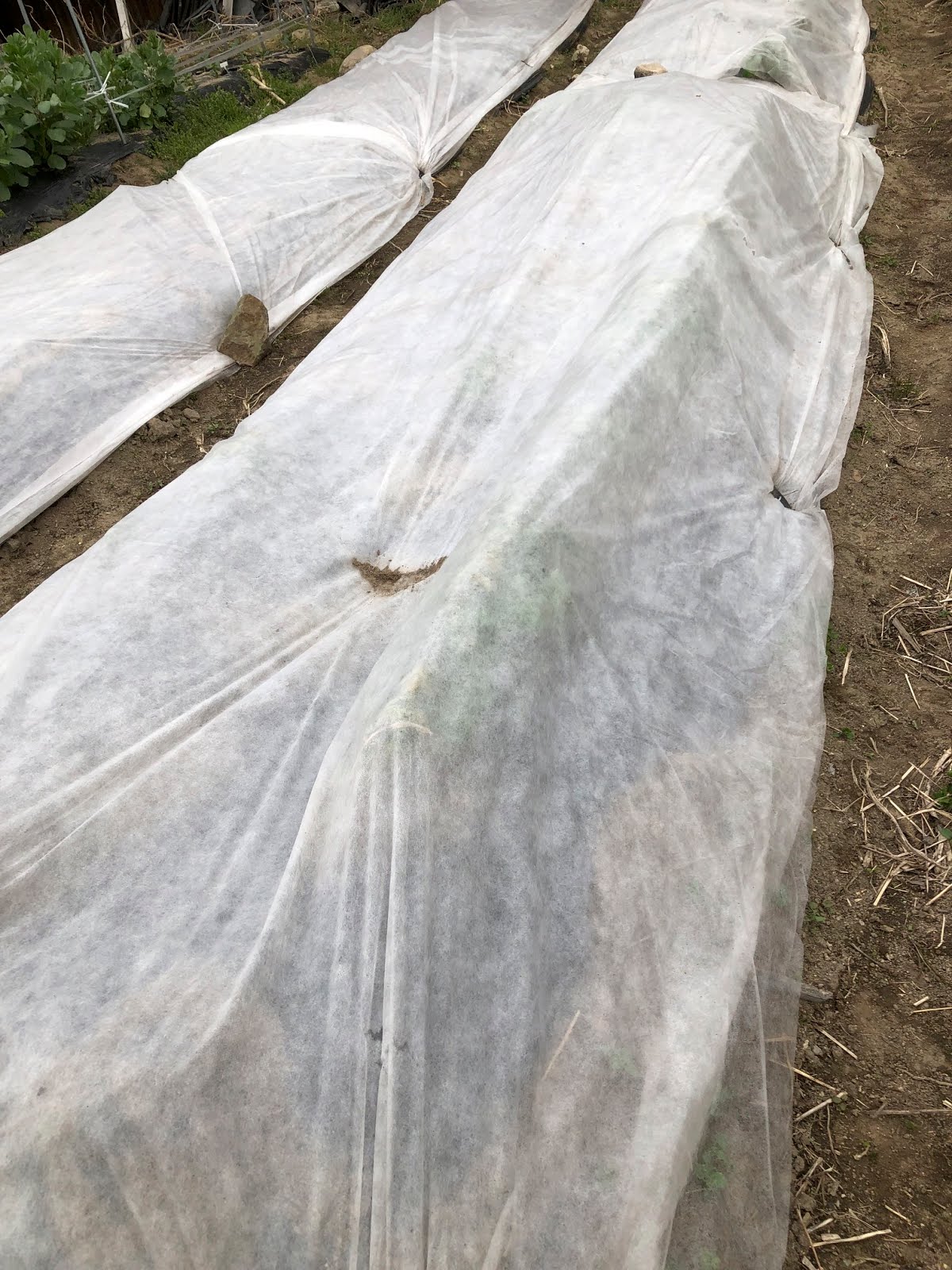 一方、こちらは同じく第2菜園のメインの畝で、最初から少し緩めに不織布をかけていたところ。