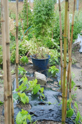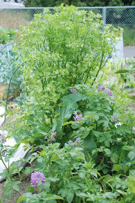 | こんな背高のっぽになっても茎は最近まで食べれていた。 今はさすがに硬くなっているかもしれない。 手前に見える紫の花はデストロイヤー(ジャガイモ)。 |