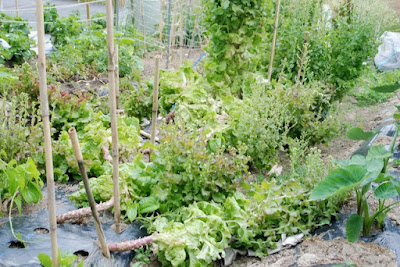 | 5〜6本のサニーレタスを抜いたのだが、まだ同じくらい残っている。 残っているサニーレタスの影には小さくて見えないツクネ芋の苗がある。 彼らは早い時期のサニーレタス撤去を願っているに違いない。 |