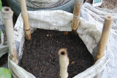 | 種を植える前の土嚢袋の土には十二分に水を浸み込ませている。 |