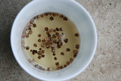 ゴボウの種を植えたときと同じように、ピンセットで種をつまんで、一つの土嚢袋に6〜8個づつ植えていった。