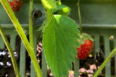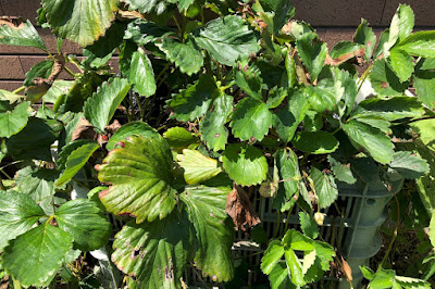 | 3段に重ねたコンテナで、自作のストロベリータワーを作っている。 昨年植えた苗は大きくなり、あちこちに小さな苗が育ちつつある。 しかし、まだ満足な収穫にはなっていない。 |