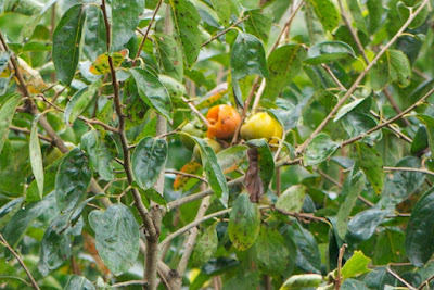 もうすぐ収穫の時期だろうと思われた富有柿は、熟れたものからカラスにつつかれているようだ。