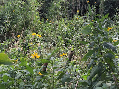 | 今ではセイタカアワダチソウよりツクネ芋やゴーヤの方が目立っている第2菜園。 見た目分かり難いが、ここには結構色々な野菜を植えている。 |