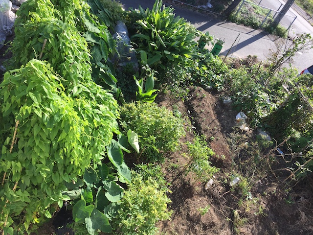 | 今ではセイタカアワダチソウよりツクネ芋やゴーヤの方が目立っている第2菜園。 見た目分かり難いが、ここには結構色々な野菜を植えている。 |