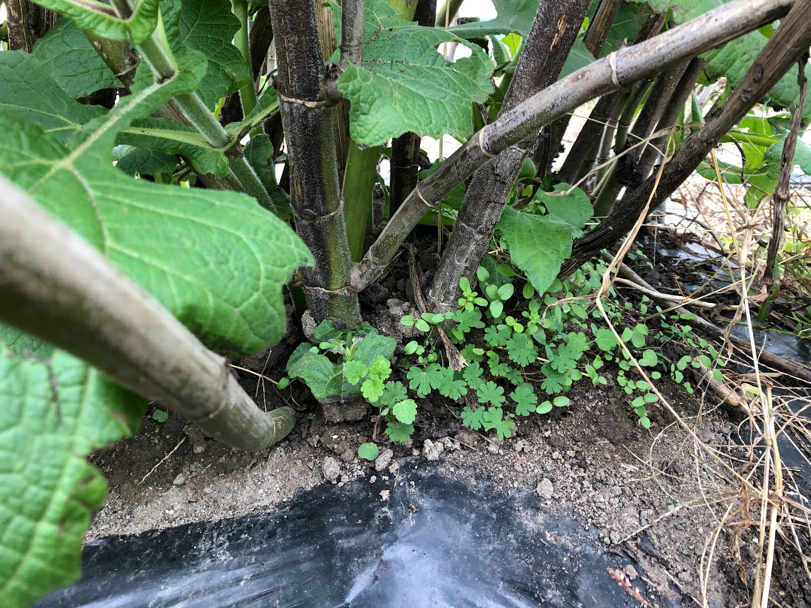 茎元の太いものは3cmくらいあったので、マルチの下に大きな芋が隠れていると思った。 マルチがなんとなく、下から突き上げられているように見えたのだ。 |
