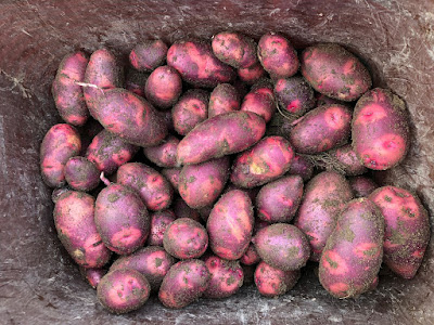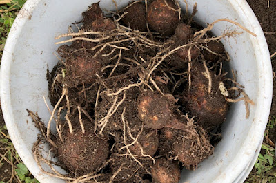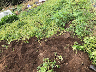 今日収穫したのは全体の1/5くらいだろう。 去年は11月の後半に霜でやられて大きな芋が取れなかった。 |