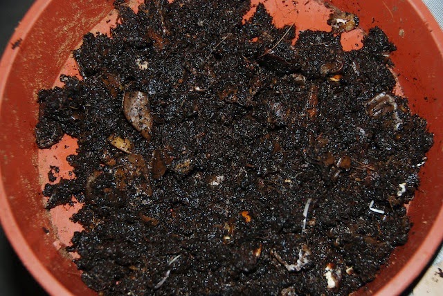 | ウェットな環境(堆肥+食べ物の残渣)には卵胞がたくさん残っている。 そのことを危惧して、前回分別時にウェットな環境をそのまま観察小屋に戻した。 それが悪かったのか、今回はもっとウェットで危険な環境になっていた。 今回はたとえ赤ちゃんや卵胞がたくさんここに残っていようと環境を破棄した。 |