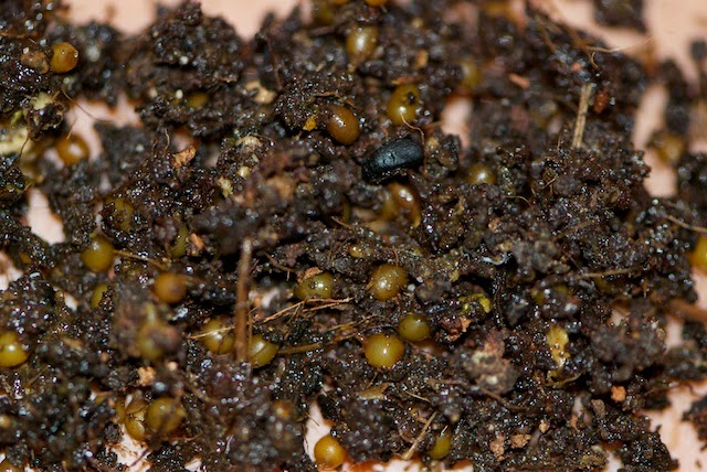 | この食べ残しの餌には多くの卵胞が付着している。 赤ちゃんミミズもかなり餌の中に紛れ込んでいるに違いない。 これらは新しい餌や乾き気味のココ繊維とともに観察小屋に戻した。 |