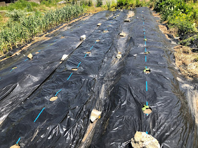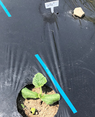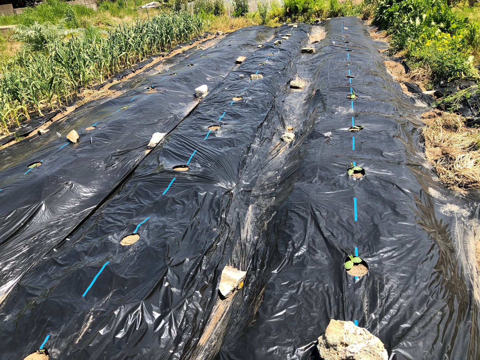| ここがズッキーニの畝。 ここに7種類のズッキーニの種を蒔いている。 今、植え穴から芽を出しているのは8割ほど。 |