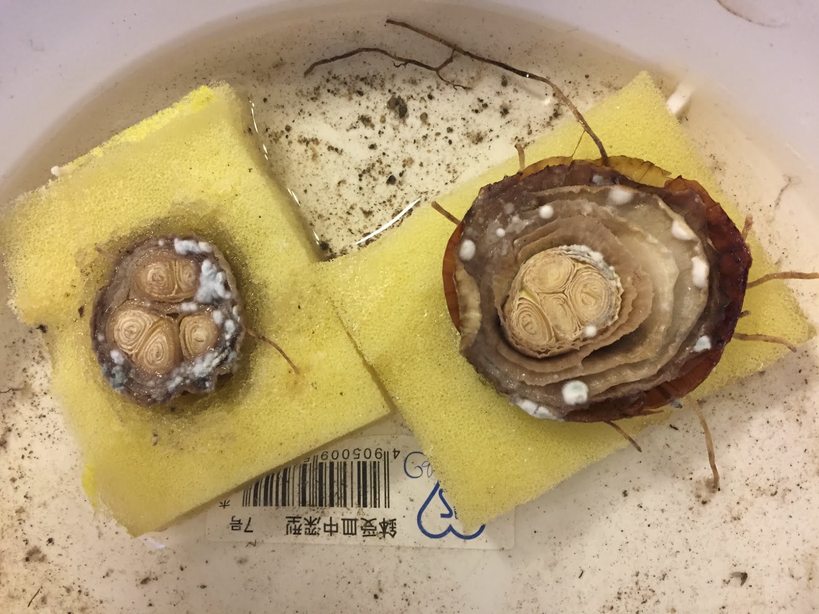 | 2個とも、お尻のところが腐れ、上面には芽が出ず、見えるのはカビ。 |