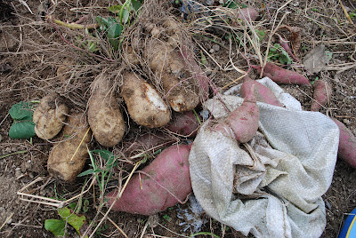 | 今日はツクネ芋の初収穫。今日の夕飯は楽しみ。土嚢袋でのサツマイモ収穫も順調。写真では土嚢袋の底を突き破って抜けなくなったサツマイモ、苦しそう。 |