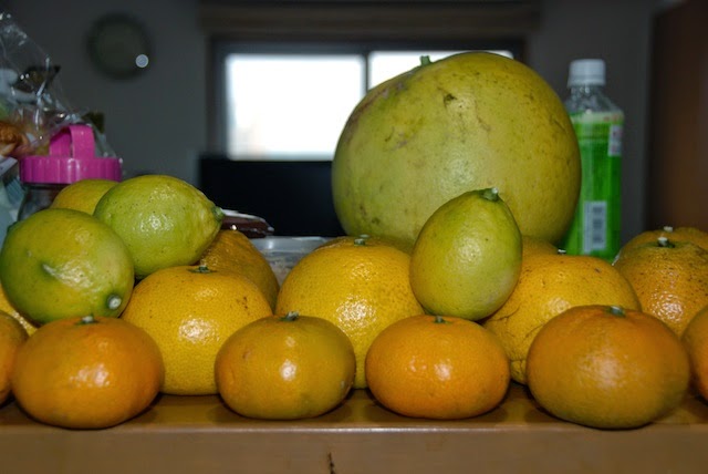 | 手前から温州みかん、レモン&八朔、伊予柑(少し隠れている)そして晩白柚。 |