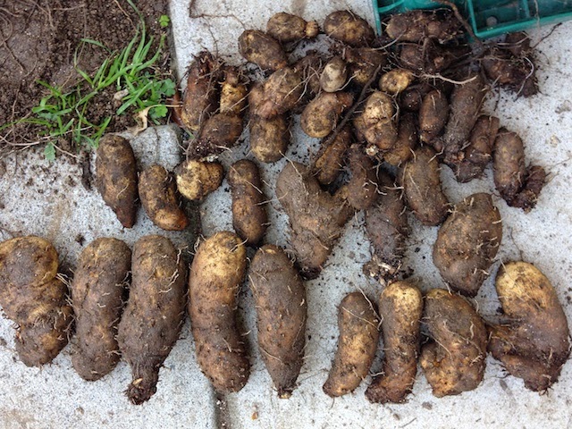 | こちらも昨日の収穫3株分。今のところ食べる分には不自由していない。 お裾分けも少しは出来そうだ。 また、管理さえうまくいけば来春に種芋はたくさん残せそうだ。 |