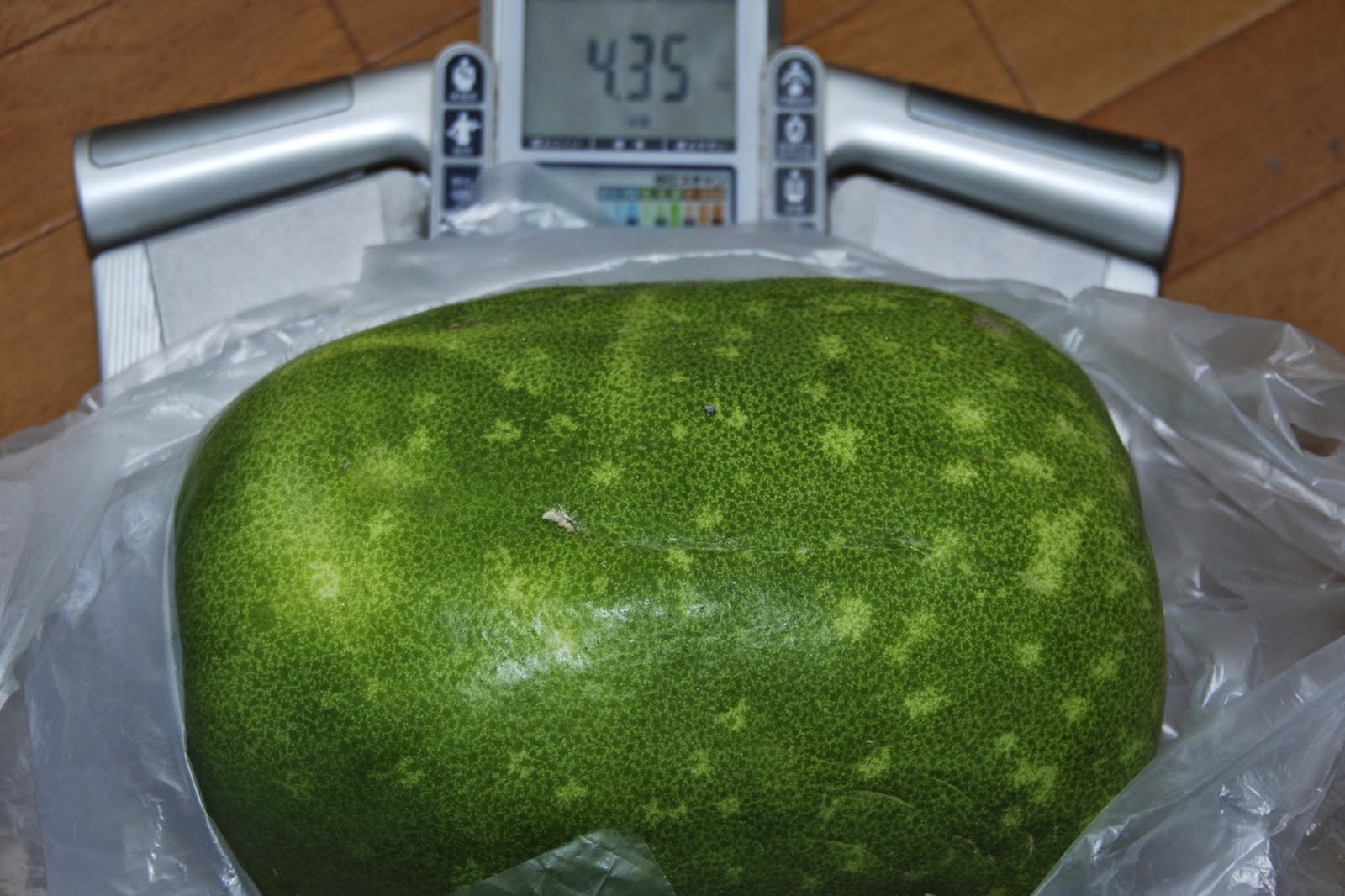 | さすがに冬瓜は大きくなる。この実は4.35kgもあった! 採れたての冬瓜には細かなトゲが付いているのでビニール袋に入れて運ぶ。 「冬瓜は強過ぎて困る。イノシシも冬瓜だけは食べない」と嘆いていたおばさんがいた。 私は冬瓜料理は大好きだ。 |