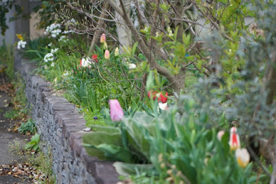 | ここからはチューリップやアリウムコロニーなどが見えている。 もうすぐ利休梅や黄色いモクレンも咲き始めるはずだ。 |