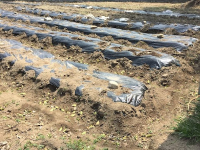 1月にユンボで笹竹の根っこを掘り起こしてもらったところに、先月は少しづつ畝を立て、今月はそれらの畝にデストロイヤー、ヤーコン、里芋、つくね芋などの種芋を植え、またズッキーニやかぼちゃの種を蒔いた。